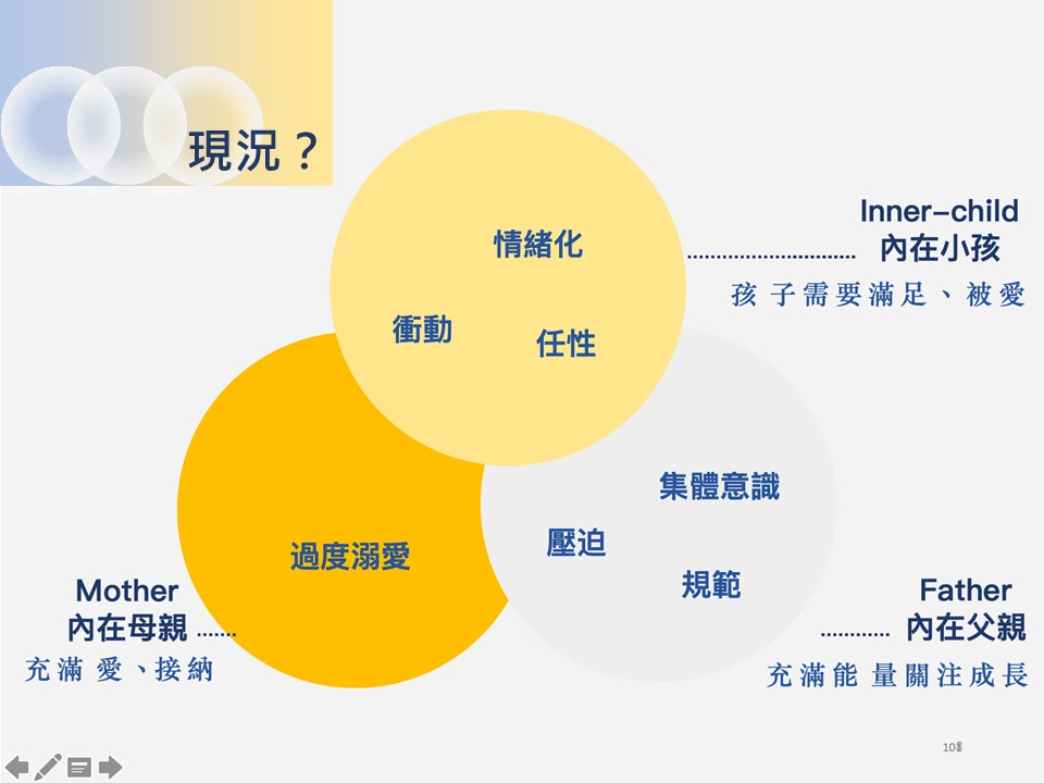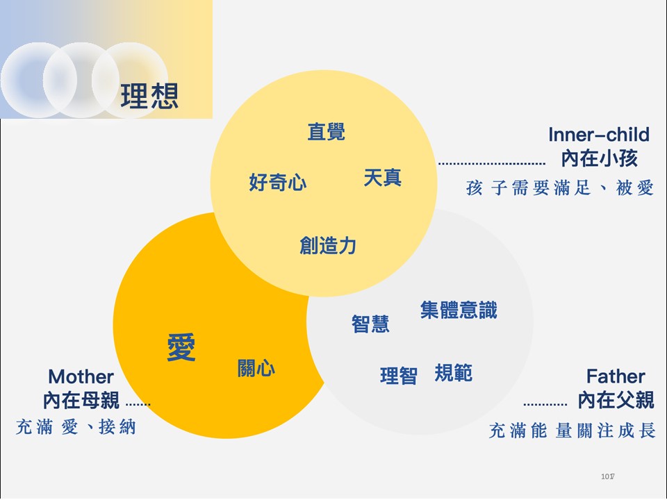 一個被關注、被愛的內在小孩,可以引領我們找到內在高我的智慧,因此請別忽略內在小孩的力量,身為大人的我們越是脆弱,代表內在小孩越是需要我們愛的關注,只要能夠跳脫自我侷限,以三位一體、每個人內在都有一個母親、父親和小孩的內在家庭概念,來重新檢視自己的內在關係,是發揮了三位一體的完美人格? 還是讓你的內在小孩缺乏內在母親的關愛?
