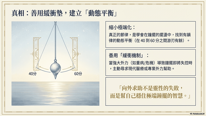 - 啟動緩衝機制: 當強大外力使鐘擺即將失控時,主動尋求專業醫療或現代科技的協助,這並非靈性失敗,而是穩住系統的戰略選擇。