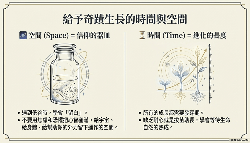 - 空間的策略性(信仰的器皿): 將「空間」視為承載奇蹟的容器。在低谷時, 策略性留白 (Strategic Empty Space)是高等創造者的必備修養。拒絕用焦慮塞滿心智,才能為宇宙、身體自癒力及專業外力的運作預留施展餘地。